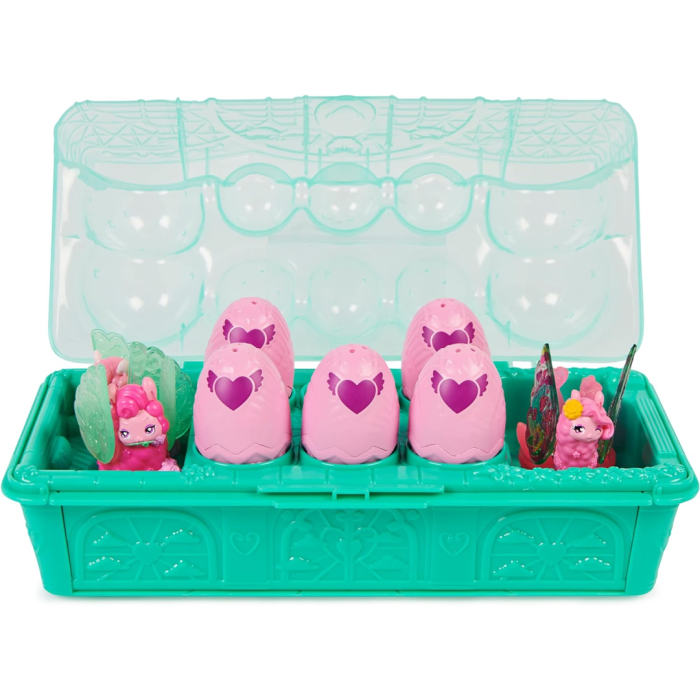 Surprises abound in this exquisitely designed Hatchimals egg carton. Inside is a hidden theme park playset, two play accessories, and ten llama characters enjoying a Rainbow-cation. When you open the box, you'll find two parents, a big kid, five Hatchimals eggs, and accessories. Discover the remaining members of the Family Carton cast, including three Little Kids and four adorable llama Babies, by cracking open the surprise eggs. Once your new buddies have hatched, open the lid of the Family Carton to see the playground within. Enjoy the ultimate day out at the Hatchimals amusement park by folding down the front of the carton and setting up the themed background. To create a spinnable egg ride, attach the egg bases to the playset and insert your figures inside. Additionally, you may enhance your pretend play narrative by using the bumper car and boat ride accessories. It is a lot of fun. You may either open the box and put your family inside or seal it and carry the Llama Florists with you wherever you go. Complete all nine Hatchimals Families with over 60 brand-new Rainbow-cation Hatchimals to collect (girls toys, each sold separately).